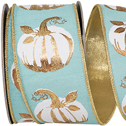 Celebrate fall with an unexpected pop of elegance. Our White Gilded Pumpkin Deluxe Ribbonin a soft tealbackground brings a fresh, upscale twist to autumn décor. Measuring 2.5 inches wide and 10 yards long, this wired-edge ribbon features beautifully detailed white pumpkins with shimmering gold accents and trim. The luxe satin finish and structured edge make it ideal for creating graceful bows, layering tablescapes, or adding a seasonal statement to wreaths and garlands. Perfect for refined harvest displays with a hint of modern charm.