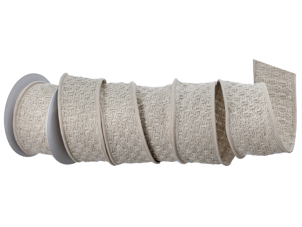 This 2.5" x 5 YDS Cream Cotton Basket Weave Ribbon features a textured basket weave pattern in a soft, neutral cream tone. Crafted from high-quality cotton, it offers a natural, tactile finish with understated elegance. The wired edges provide shape and flexibility, making it ideal for rustic-chic décor, gift wrapping, and organic seasonal arrangements.