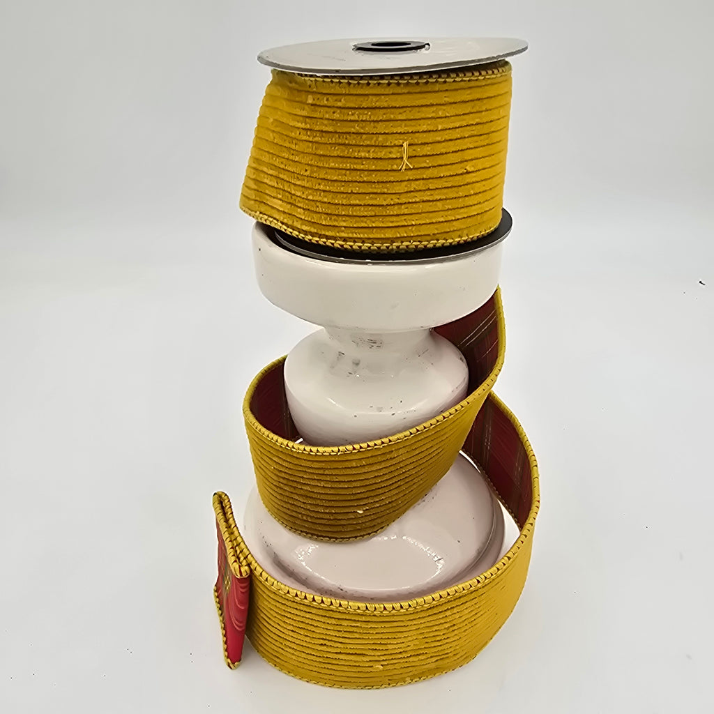 Add cozy texture and classic charm to your decor with this 2.5" corduroy ribbon in a warm mustard hue, featuring a stylish plaid backing for a subtle twist. The ribbed corduroy front brings soft, touchable dimension, while the wired edge ensures structure for bows and accents.