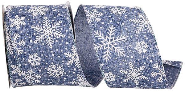 Celebrate the season with this 2.5-inch wide, 10-yard long snowflake ribbon featuring a charming iridescent denim texture. Adorned with white snowflake patterns and shimmering accents, this ribbon offers a wintry touch perfect for holiday decorating. The wired edges provide easy shaping for bows, wreaths, gift wrapping, and festive craft projects.