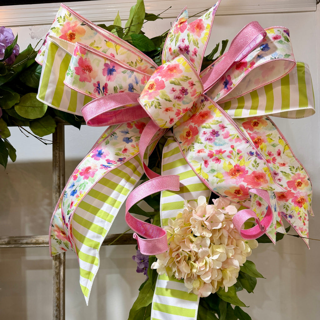 Add a touch of garden elegance to your home with this handcrafted, multi-ribbon masterpiece. Featuring a vibrant mix of watercolor florals, crisp lime stripes, and shimmering pink accents, this extra-large bow is designed to be the focal point of any wreath or garland.