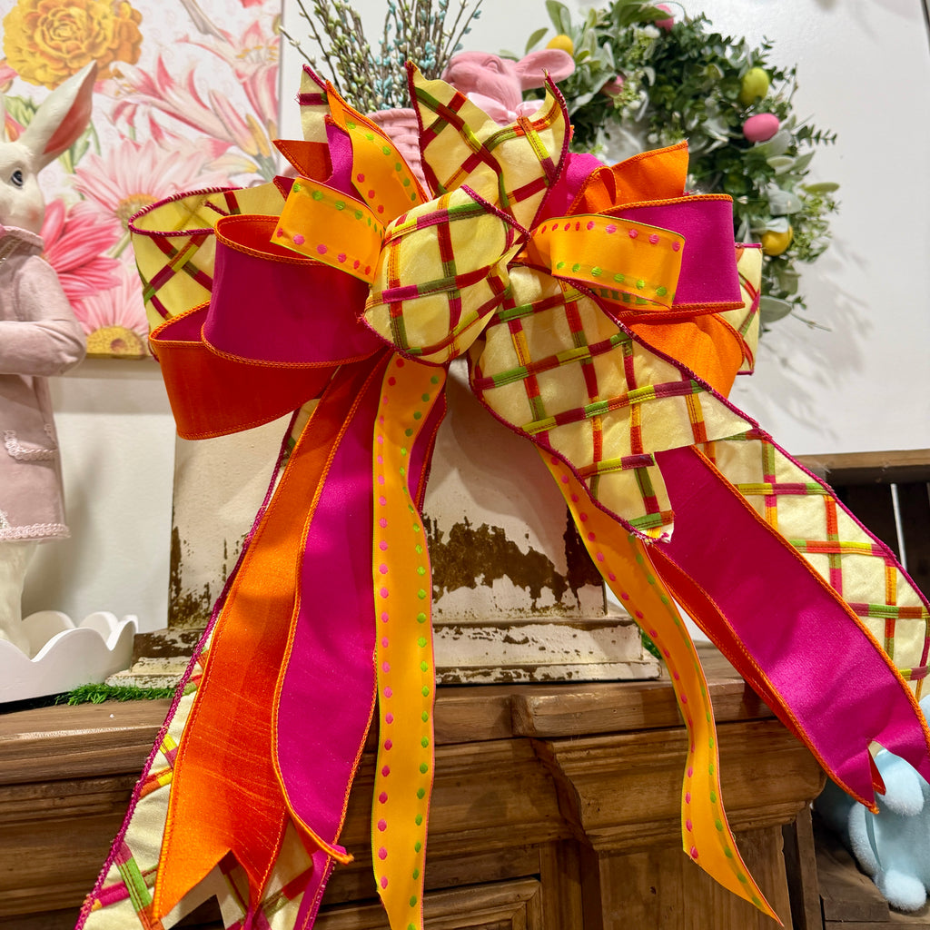 Bring your home to life with the vivid colors of our Mango Tango bow. Expertly crafted using three premium wired ribbons, this bow maintains its voluminous shape and professional look all season long. With its playful polka dots and classic windowpane plaid, it’s the perfect statement piece for wreaths, lanterns, or high-end gift wrapping.