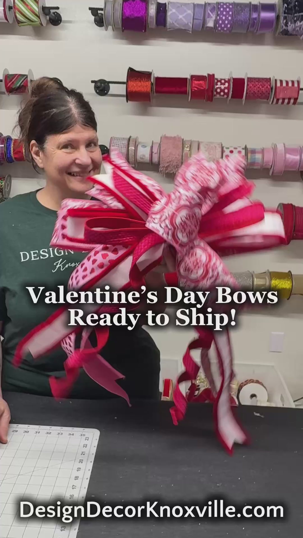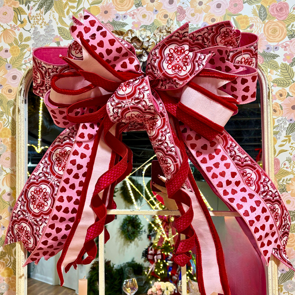 Playful pattern meets romantic charm in our 20" Sweetheart Swirl Designer Bow. Featuring rich layers of velvet hearts, blush satin, and a striking red-and-pink tile motif, this handtied beauty brings warmth, texture, and a perfectly styled finish to your Valentine’s displays. If you know the name Farrisilk, you know these are premium ribbons that make a big impact!