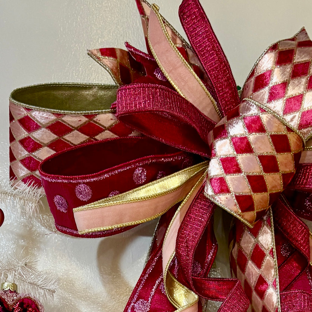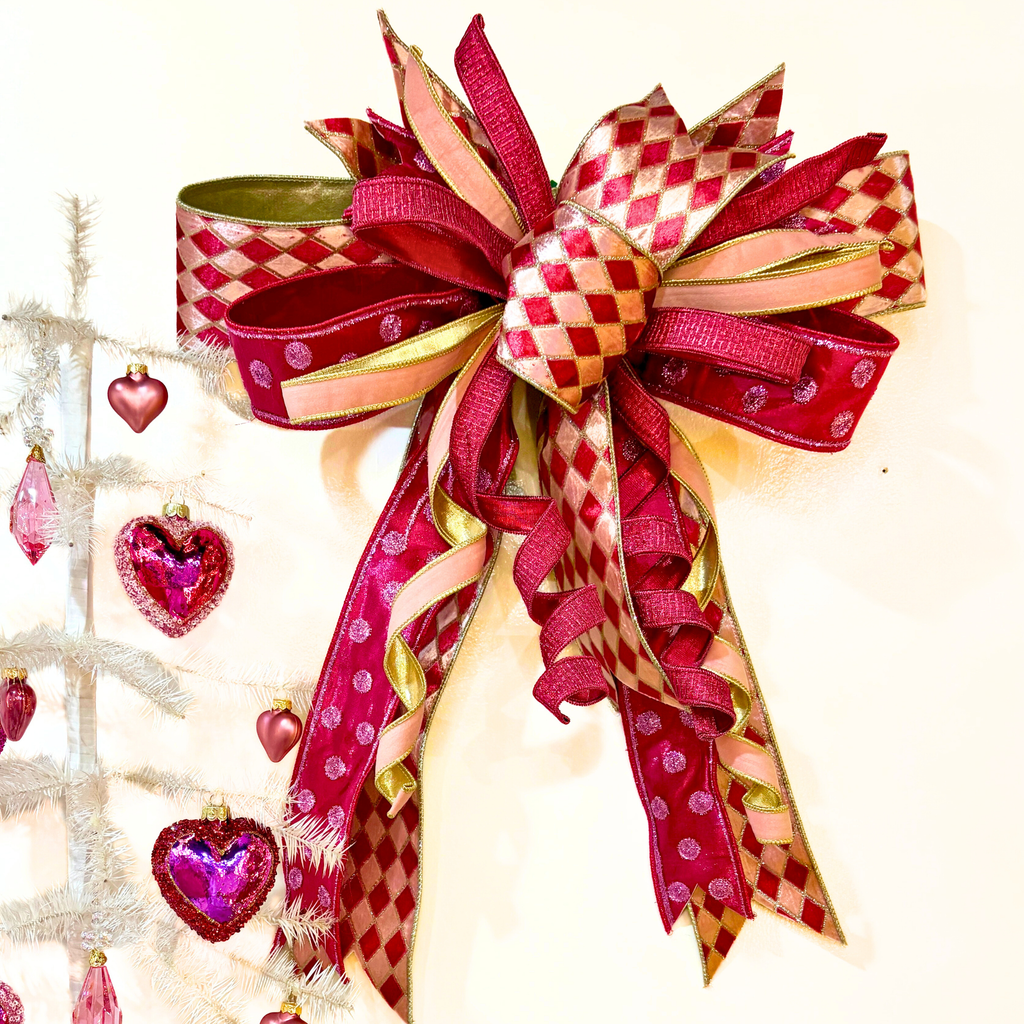 Bold pattern meets soft elegance in our 20" Berry & Blush Harlequin Designer Bow. Featuring layers of blush pink, berry red, gold trim, and harlequin check ribbon, this handtied bow blends playful whimsy with polished style — perfect for Valentine’s, romantic themes, or luxe everyday decor.