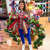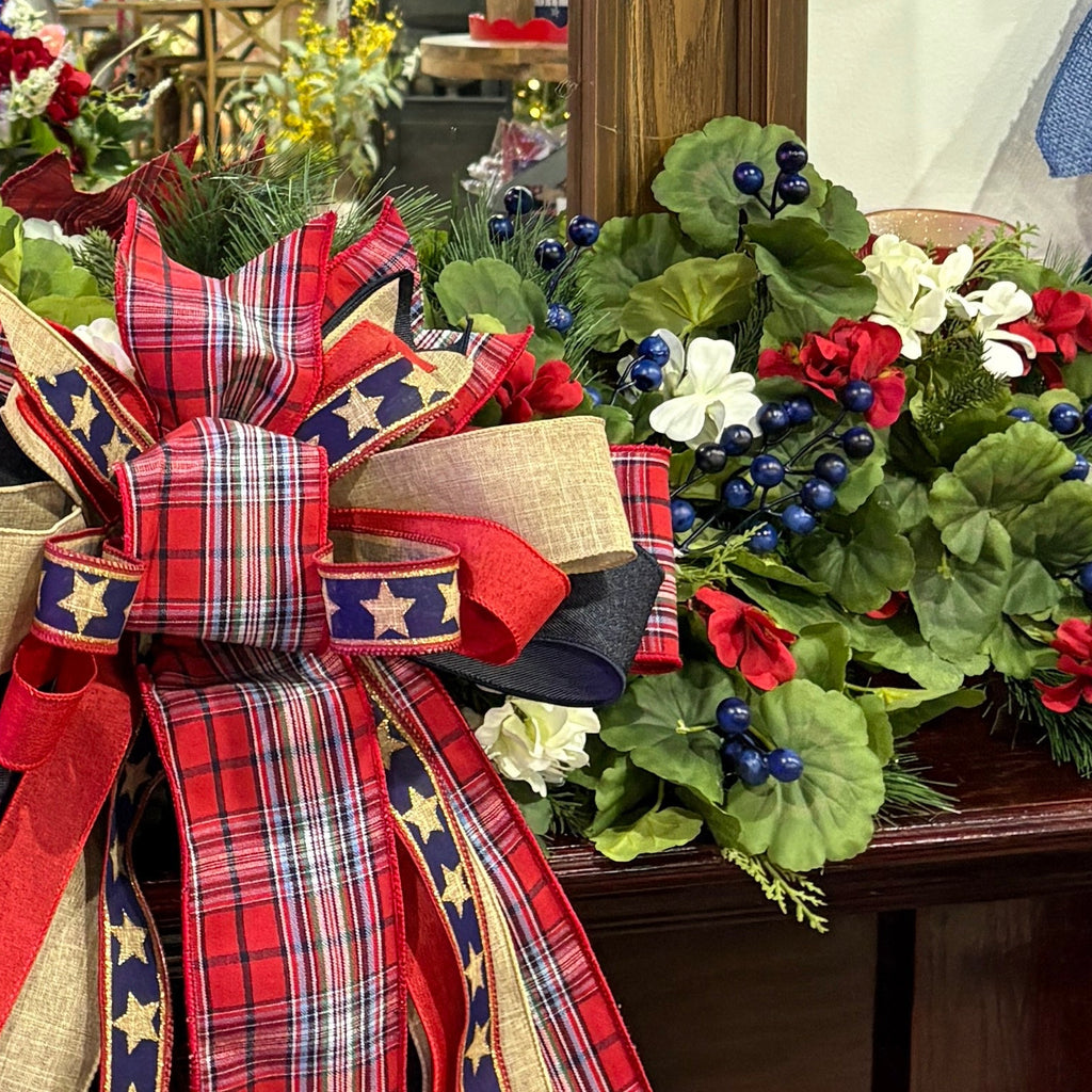 Tri-Color Floral Accents: It is heavily embellished with clusters of vibrant red geraniums, creamy white blossoms, and deep navy berries, providing a classic red, white, and blue palette without looking overly synthetic.