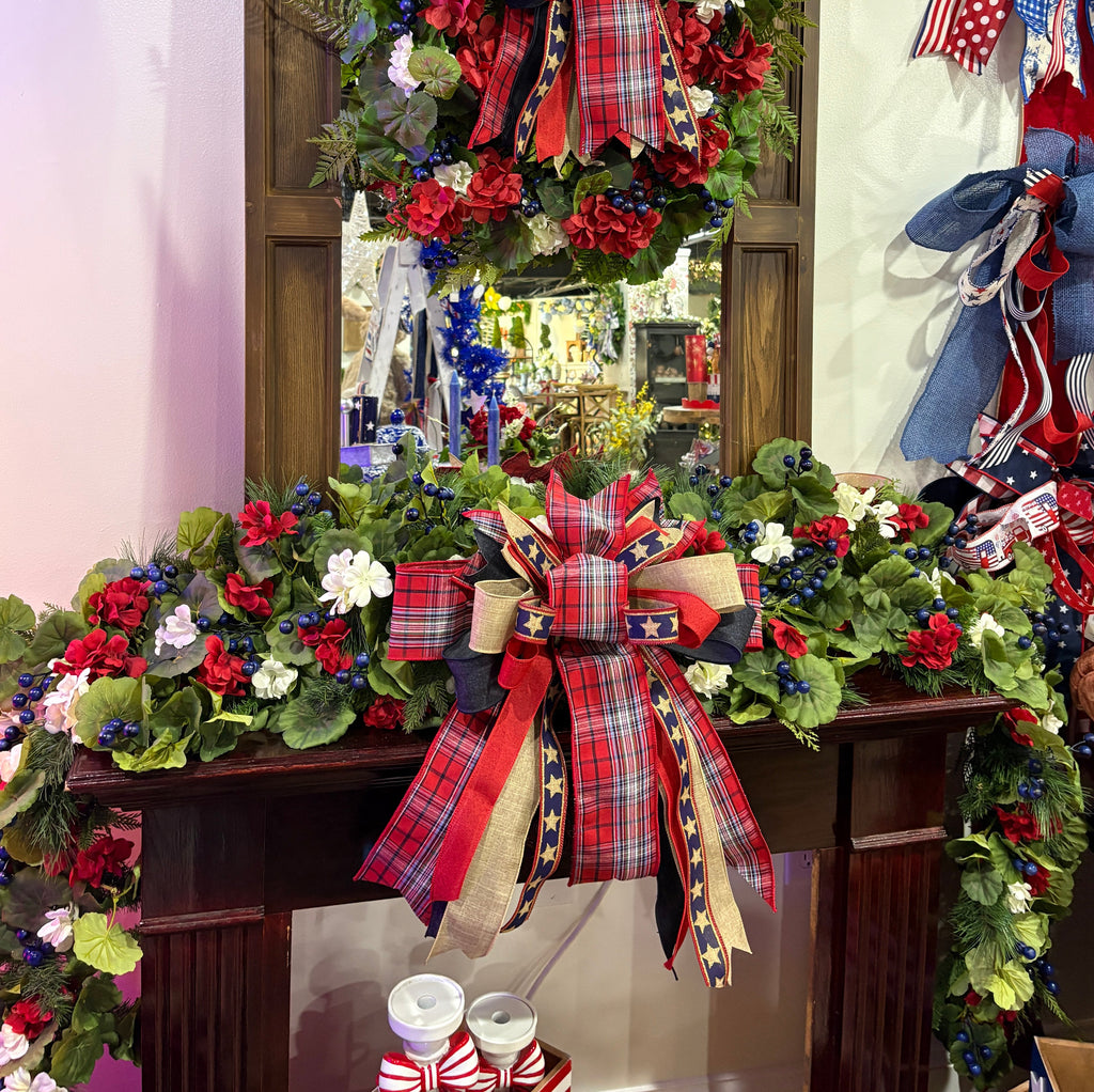This Liberty Garland is a high-end, handcrafted decorative piece designed to bring a sophisticated patriotic touch to any mantle, doorway, or banister. It blends traditional Americana colors with lush, textured greenery for a look that transitions perfectly from Memorial Day through Labor Day.