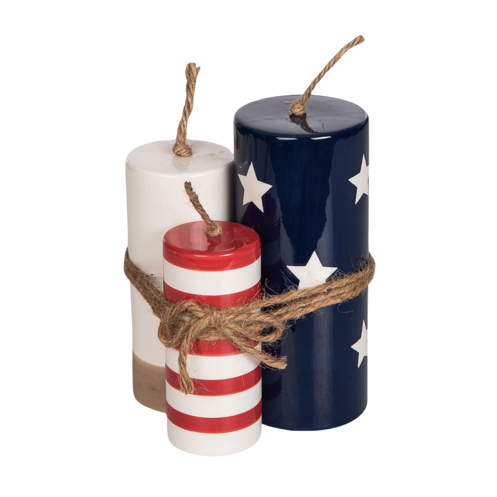 Celebrate the red, white, and blue with this charming Americana "Candle" Trio Figurine, a festive accent that brings the look of classic pillar candles without the flame. Each “candle” features a patriotic design: red and white stripes, crisp white, and navy with bold white stars, all tied together with rustic jute rope for a warm, homespun touch.