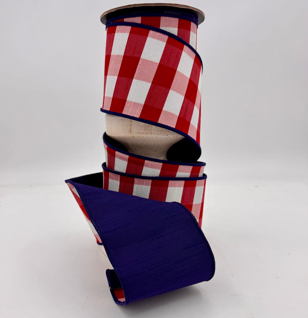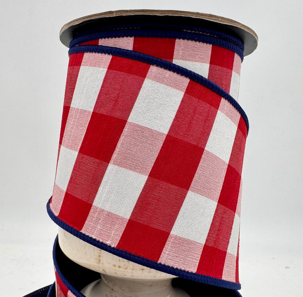 Elevate your seasonal designs with our 4" x 10YDS Faux Dupion Checked Ribbon, featuring a classic red and white check pattern accented with a crisp navy border. Crafted from luxurious faux dupion fabric, this double-sided ribbon offers a smooth finish with just the right amount of structure for perfect bows and elegant draping.