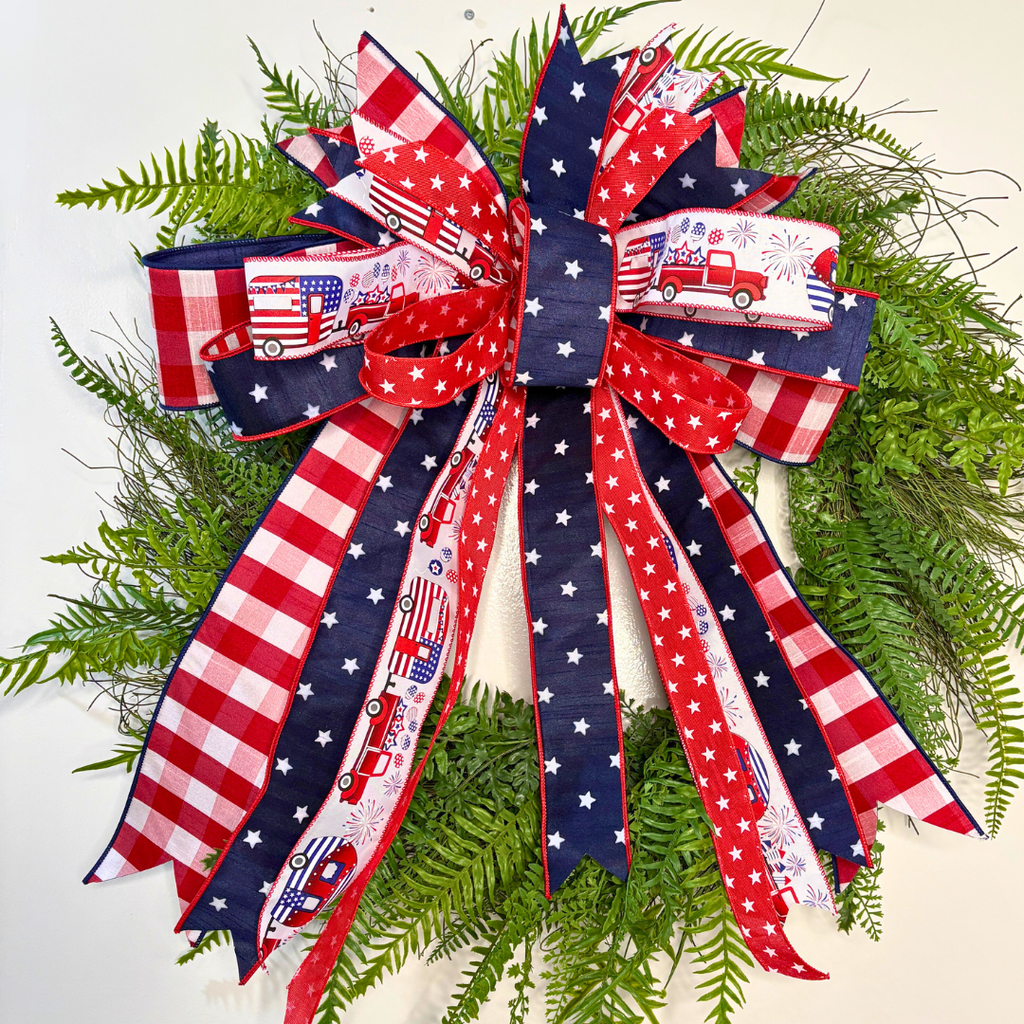 Add a touch of whimsical patriotism to your home decor with our handcrafted "Glamping in the USA" bow. This multi-layered statement piece combines classic Fourth of July spirit with a love for the great outdoors. Featuring a charming vintage aesthetic, it’s the perfect accessory for wreaths, mailboxes, or festive porch displays.
