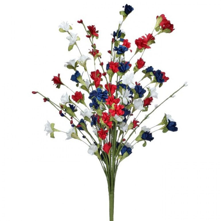 This striking floral bush offered in two colors; a festive burst of patriotic color, perfect for holiday or year-round decorating and a yellow that shines like the sun. These bundles feature numerous slender, light-green stems that fan out dramatically, creating a full and airy arrangement. The stems are adorned with a generous scattering of small, multi-petaled flowers in the complete red, white, and blue palette for the patriotic bundle and solid yellow for the summer bundle. The flowers are interspersed at various heights, giving the overall arrangement a delightful, meadow-like or wildflower appearance that is ready to be placed directly into a vase or incorporated into a larger centerpiece. Each Sold Separately