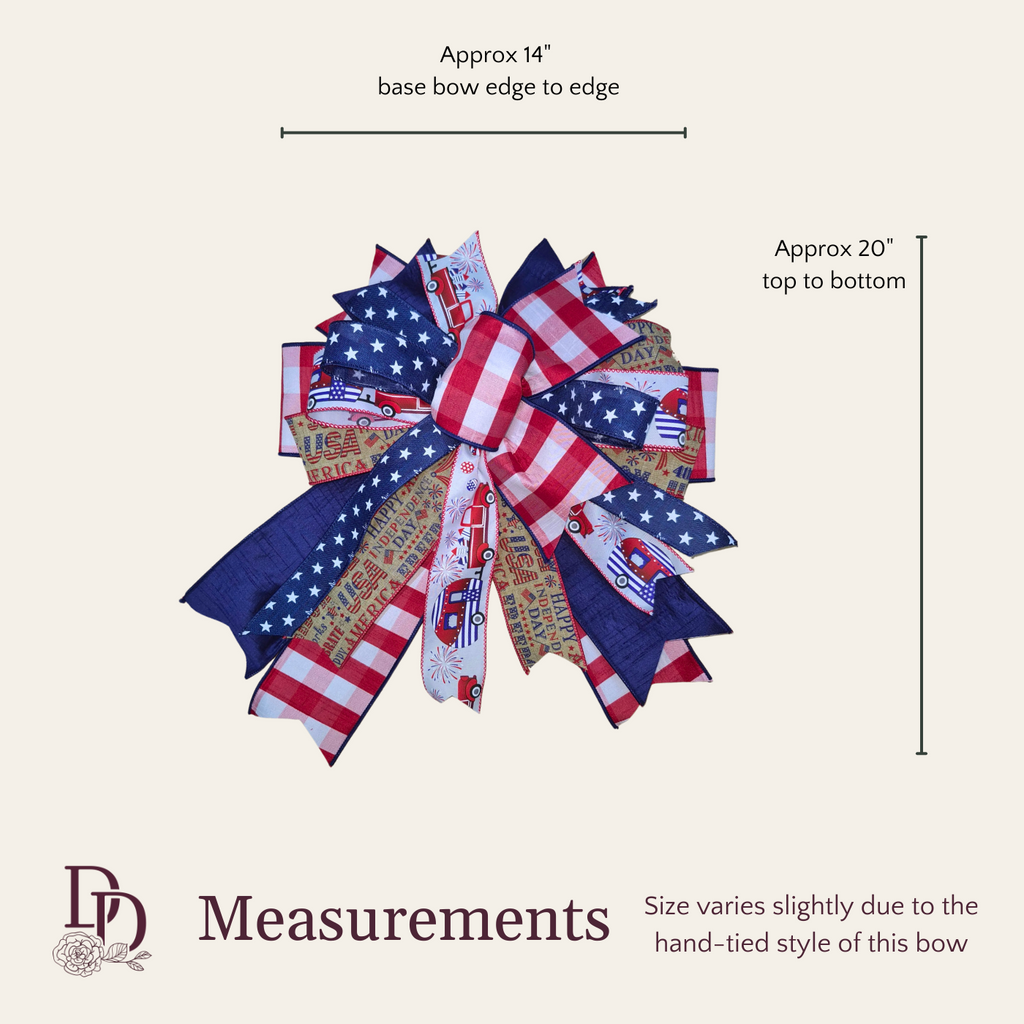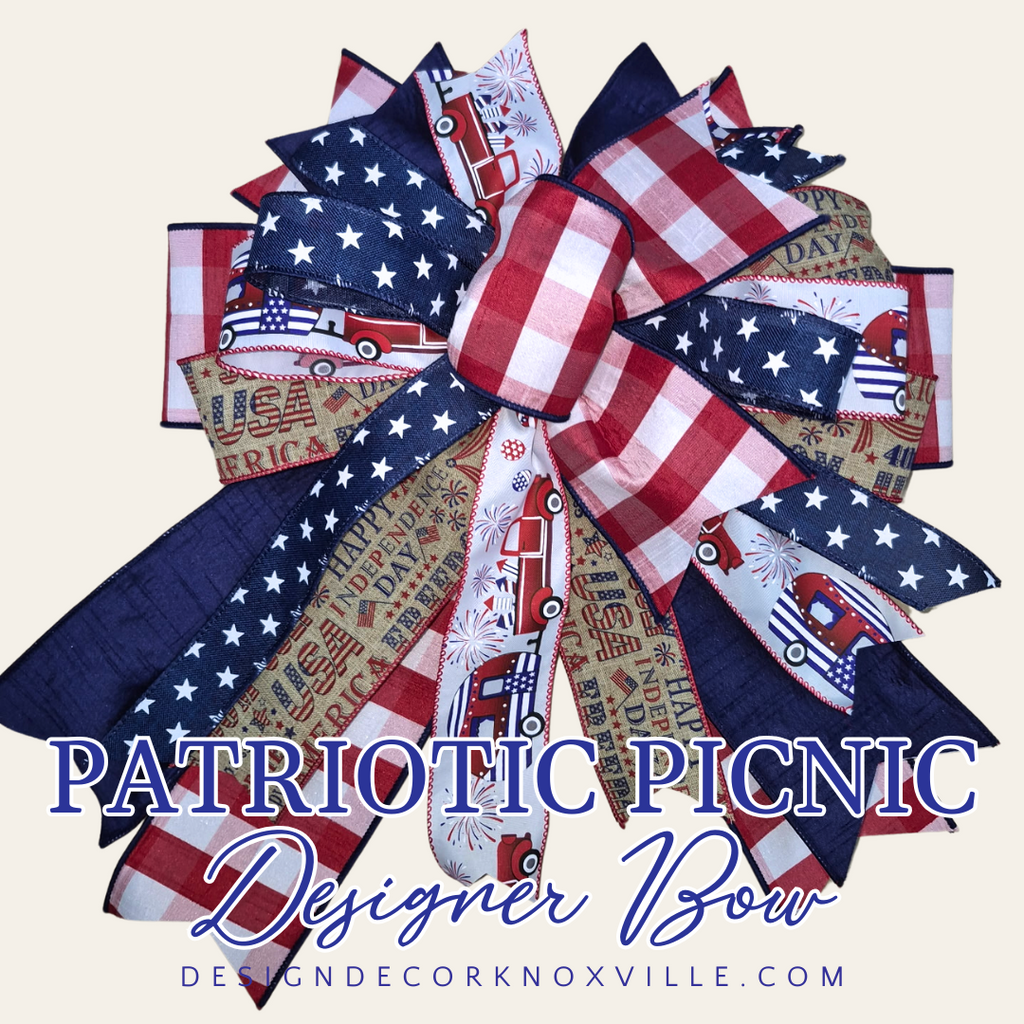 Bring a touch of nostalgic Americana to your summer décor with the Patriotic Picnic Designer Bow. Hand-tied with care, this charming bow features a festive mix of classic red gingham, star-spangled navy, and whimsical patriotic truck ribbon—all layered to create a playful yet polished look.