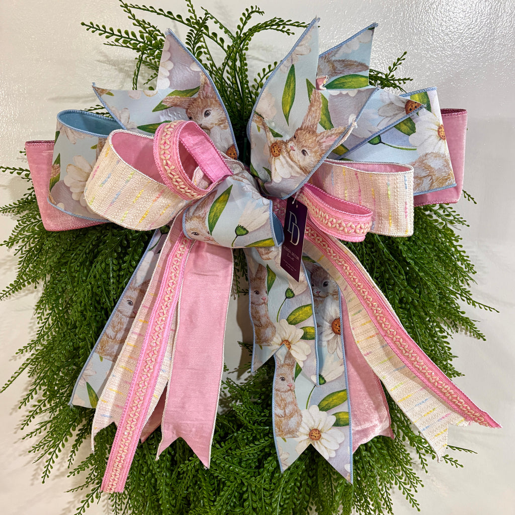 This Cottontail Meadow Bow is a charming, multi-layered decorative piece perfect for spring décor, Easter wreaths, or nursery accents. It features a curated mix of textures and whimsical patterns that evoke a nostalgic "English countryside" feel.