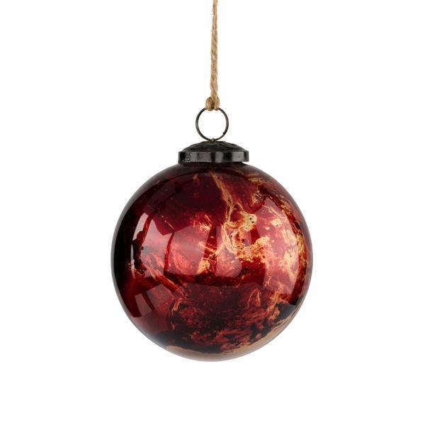 Add rich depth and dramatic flair to your holiday decor with our 4.75" Marble Glass Ball Ornament in Shiny Burgundy. This striking piece features a high-gloss finish and intricate marbled swirls of deep red, gold, and black, creating a luxurious, molten effect that reflects light beautifully.