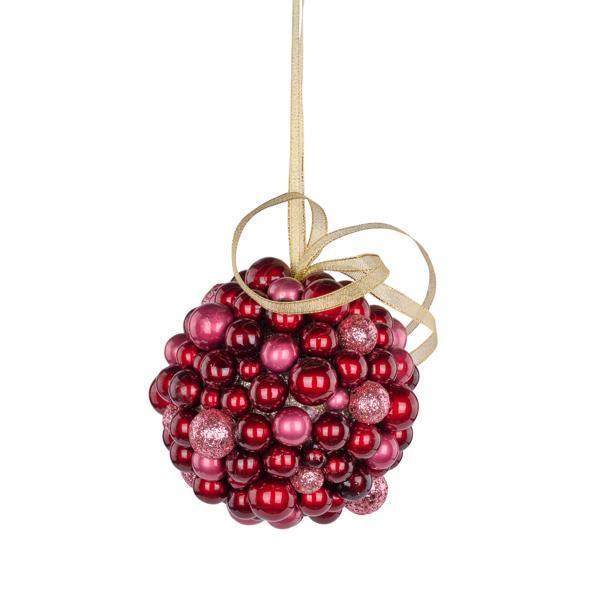Lend rich color and playful texture to your holiday décor with our 4" Mixed Size Ball Ornament in Burgundy, Mauve, and Pink. This eye-catching piece features an elegant cluster of glossy, matte, and glittered mini baubles in a harmonious blend of jewel and blush tones, tied together with a gold satin ribbon for a luxe finishing touch.