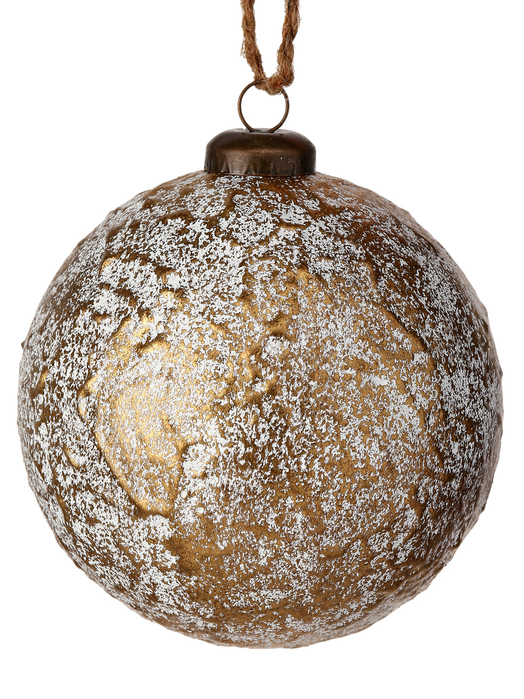 Introduce rustic glamour to your holiday decor with our 4" Faux Leather Metallic Ball Ornament. This uniquely textured ornament features a warm golden tone with a distressed metallic overlay, creating a worn leather-like finish that blends rugged charm with upscale elegance. The frosted silver dusting adds a subtle shimmer, while the natural jute hanging loop brings an artisanal touch.