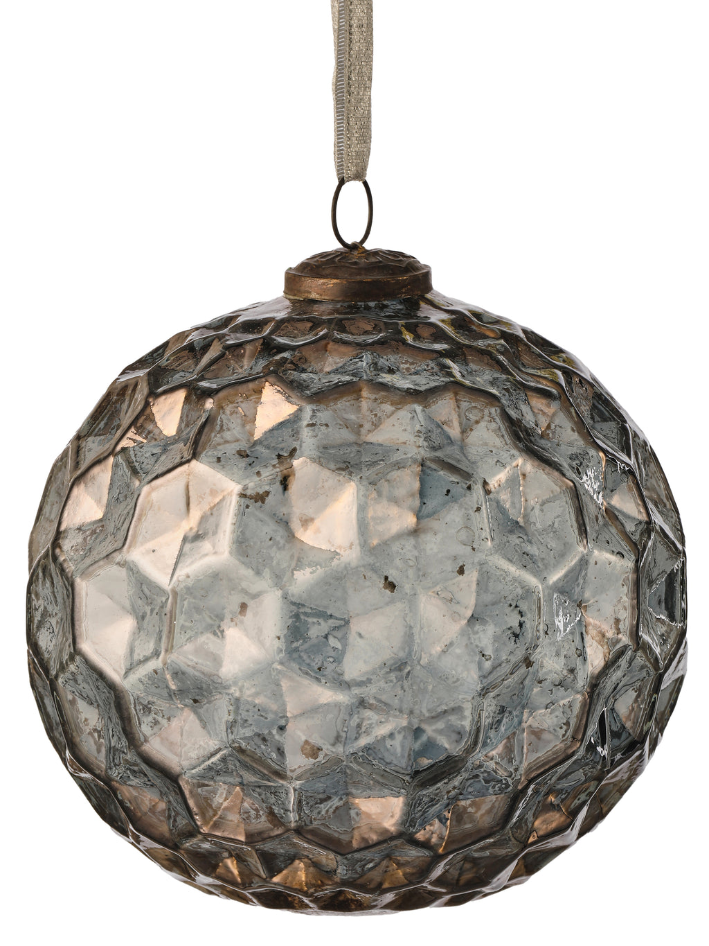 This 6" Honeycomb Glass Ball Ornament features a faceted honeycomb texture that catches and reflects light beautifully. Crafted from glass with an antiqued, smoky finish, it exudes vintage elegance with subtle shimmer. A metal cap and soft fabric loop complete the design, making it a sophisticated addition to classic and contemporary holiday décor.
