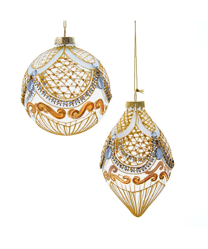 Ball Ornament – A traditional round silhouette with golden scrolls, scalloped lattice, and gemstone embellishments for a timeless look.