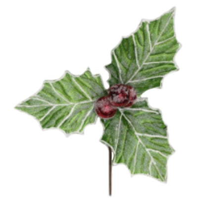 Bring a classic holiday touch to your arrangements with this 15-inch Frosted Holly Pick in traditional green and red. Featuring three richly veined holly leaves dusted with a light frosted finish and accented by two deep red berries, this pick evokes the timeless charm of winter greenery.