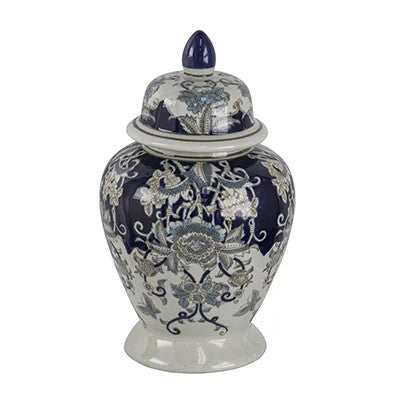 Elevate your home with the timeless sophistication of the Blue & White Ornate Ginger Jar. Featuring an intricate floral motif in deep navy and ivory tones, this jar is accented with delicate silver highlights that add subtle dimension and shimmer. Its classic silhouette and lidded top make it a perfect statement piece for shelves, consoles, or entryways.