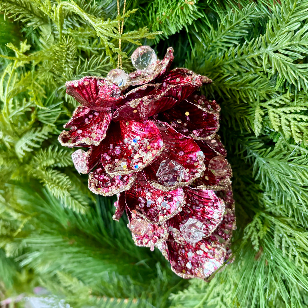 Add a touch of festive glamour to your holiday décor with our 6" Jewel Pinecone Ornament in radiant red. This richly colored ornament is designed in the shape of a classic pinecone, embellished with faceted jewel accents and shimmering finishes that catch the light beautifully.