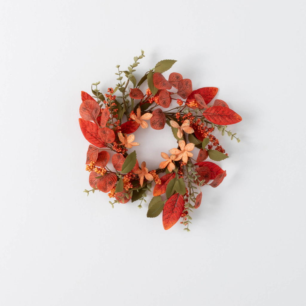 This 13" mixed fall ring captures the essence of autumn in a compact, richly detailed design. It features a vibrant assortment of deep red, orange, and golden-hued leaves, mixed with miniature berries and soft-textured florals. The combination of eucalyptus-style greenery and delicate blossoms adds layers of texture and depth, while the overall arrangement maintains a balanced, circular form. Perfect for displaying as a small wreath, around a candle, or as part of a harvest centerpiece, this fall ring brings warmth and seasonal charm to any space. Dimensions are 13"L x 4"W x 13"H. Inner dimension is 4.5".