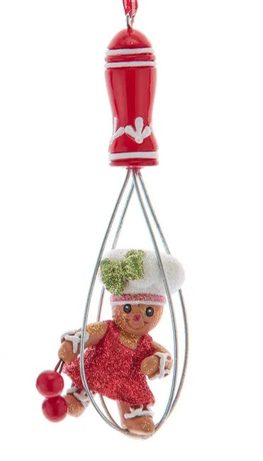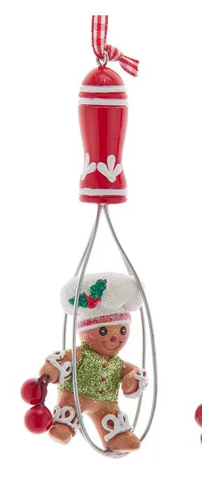 Add a dash of holiday cheer to your kitchen-themed decor with these charming 4.5-inch Gingerbread Whisk Ornaments. Each ornament features a festive gingerbread figure nestled inside a classic red-handled wire whisk, holding bright red cherries and dressed in glittered holiday attire.