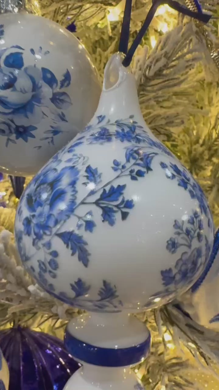 Celebrate the season with timeless elegance through this 8-inch Chinoiserie-inspired Santa ornament. Crafted in glass, Santa is dressed in a flowing robe adorned with intricate blue floral patterns on a crisp white background, blending classic holiday charm with refined artistry. A standout piece for traditional, chinoiserie, or blue-and-white holiday décor.
