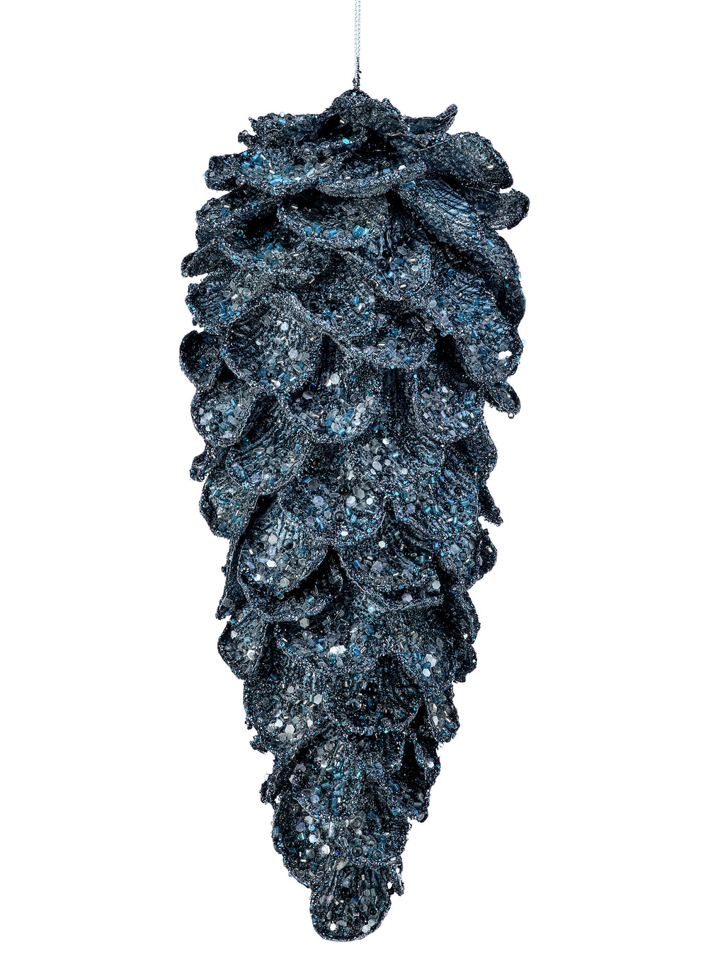 This oversized pinecone ornament is layered in deep denim blue tones, encrusted with shimmering glitter and faceted jewel accents that catch the light from every angle. At 11.5" tall, it adds bold texture and visual weight to trees, wreaths, and garlands.
