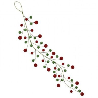 Bring festive charm and dazzling sparkle to your holiday décor with this 53-inch Green & Red Glitter Ball Garland. Featuring an elegant cascade of red and green glittered spheres on flexible, vine-like stems, this garland adds a playful yet sophisticated touch to any seasonal display. The shimmering finish catches the light beautifully, creating a dynamic, eye-catching effect.