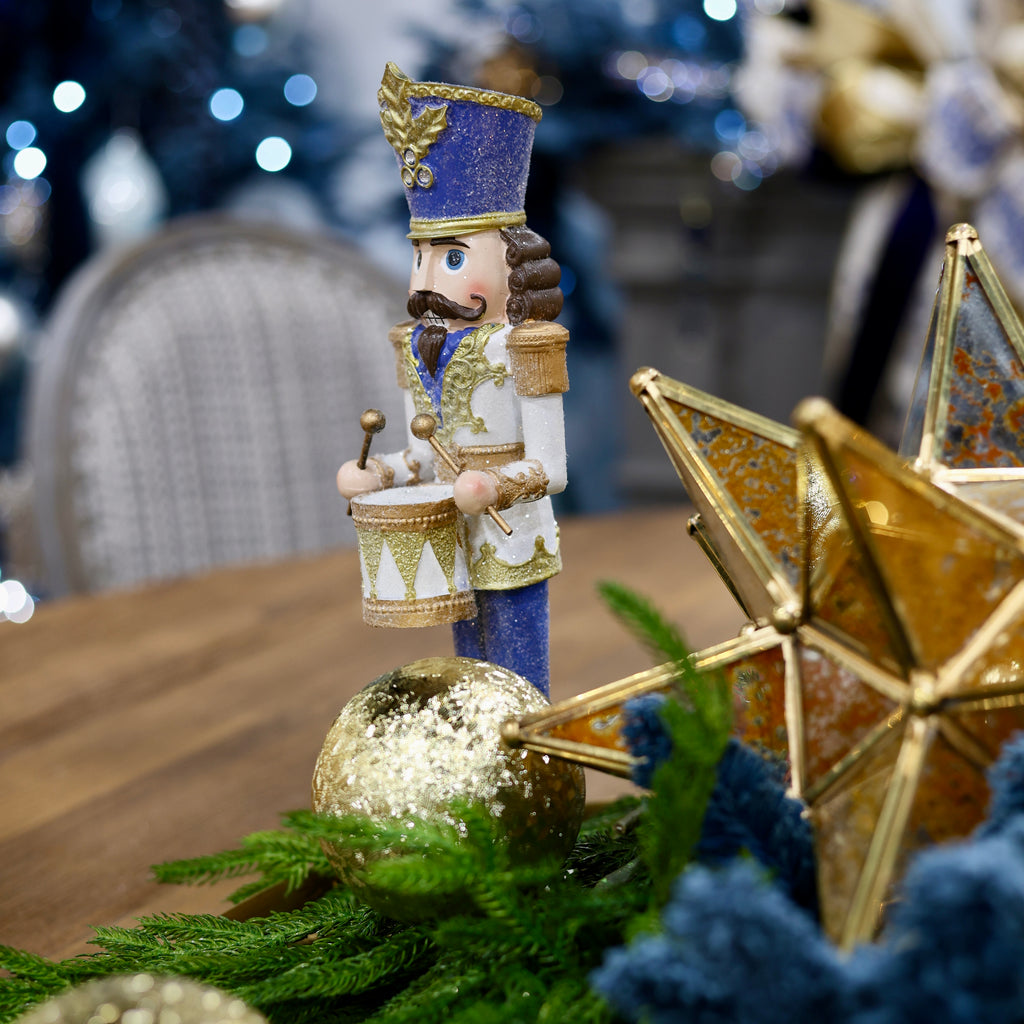 This nutcracker features a tall, navy hat adorned with a golden laurel accent, echoing a traditional military design. He holds a pair of drumsticks poised over a gold and white drum and wears a white jacket with golden epaulets and intricate trim. Glittered blue pants and gold-dusted boots complete the look, giving him a stately and celebratory presence.