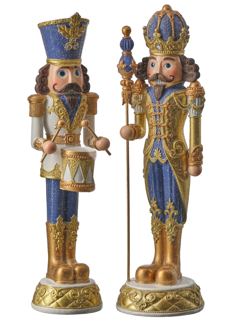 14" Champagne & Blue Regal Nutcracker Classic elegance meets royal holiday splendor. These richly adorned 14-inch nutcrackers are a celebration of timeless tradition with a luxurious twist. Dressed in deep sapphire blue, champagne gold, and white with intricate detailing and glittering finishes, each figure stands on an ornate pedestal base. Sold separately, each style brings its own regal charm—perfect for mantels, sideboards, or festive centerpieces.