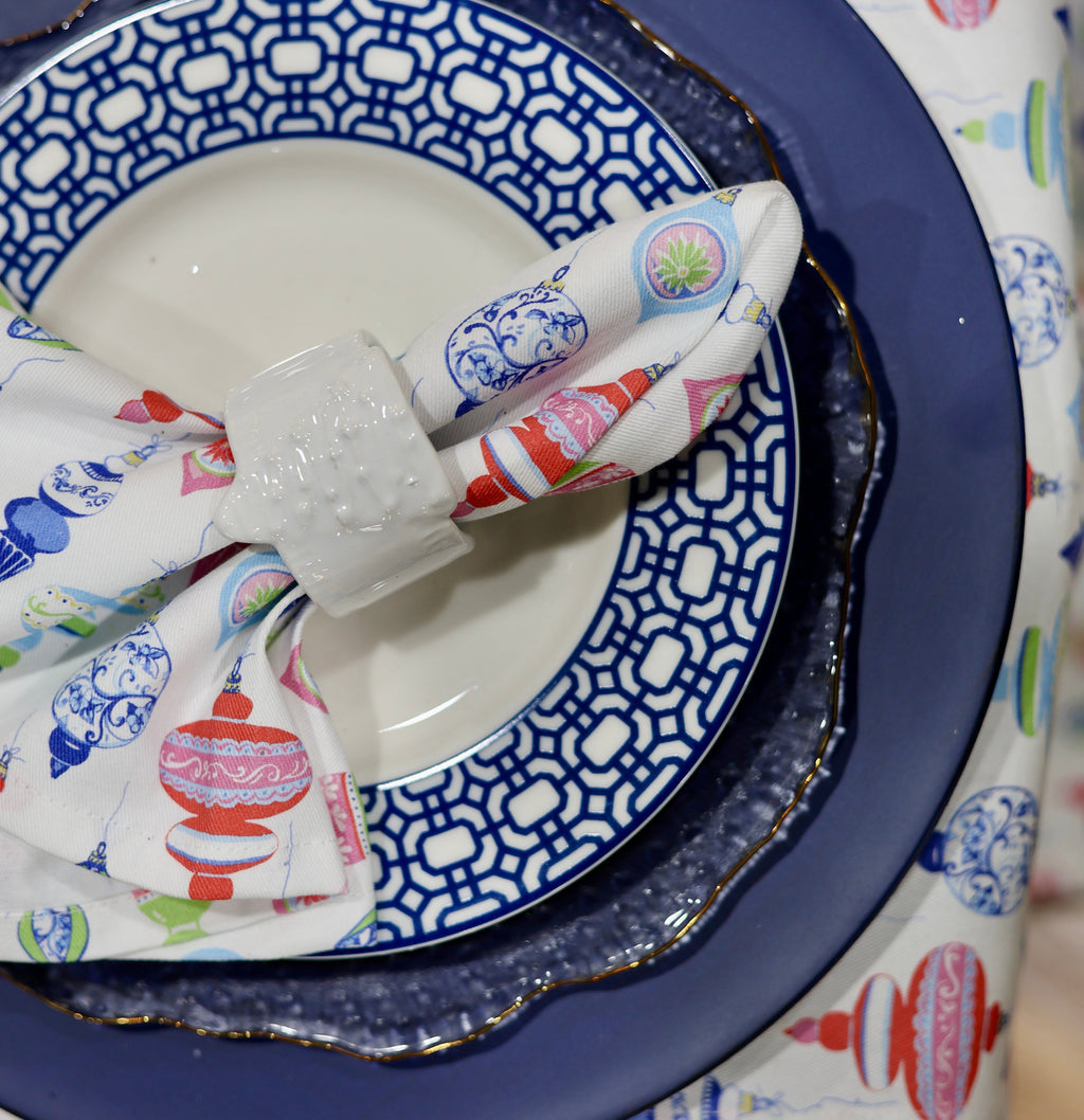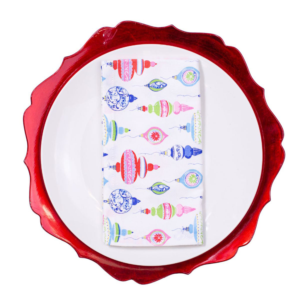 The 18"x18" Whimsical Wonders Napkin is a festive celebration of color and playfulness, bringing a joyful twist to holiday dining. Adorned with an array of vintage-inspired ornaments in shades of blue, pink, green, and red, the design feels both nostalgic and refreshingly modern. Its crisp white backdrop keeps the look light and bright, while the vibrant details invite layering with bold chargers and elegant dinnerware.