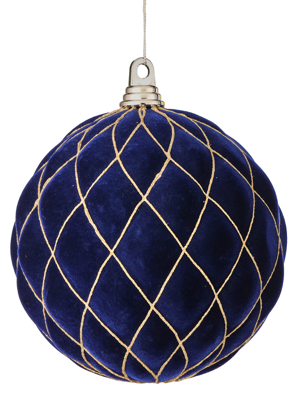 Draped in deep midnight blue flocking and wrapped in a delicate lattice of golden glitter, this oversized ball ornament exudes timeless elegance. The plush velvet texture adds warmth and luxury, while the diamond pattern catches the light with just the right hint of sparkle.