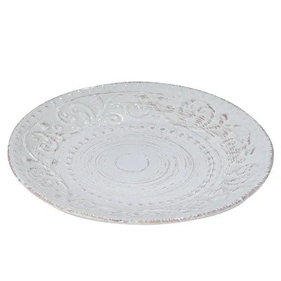 Bring graceful texture and timeless simplicity to your table with the Rustic Flare White Plate, available in both 11" dinner and 8" salad sizes (sold separately). Featuring an embossed scroll and floral pattern with a gently distressed white glaze, this plate adds a refined rustic feel to everyday meals and special gatherings alike.