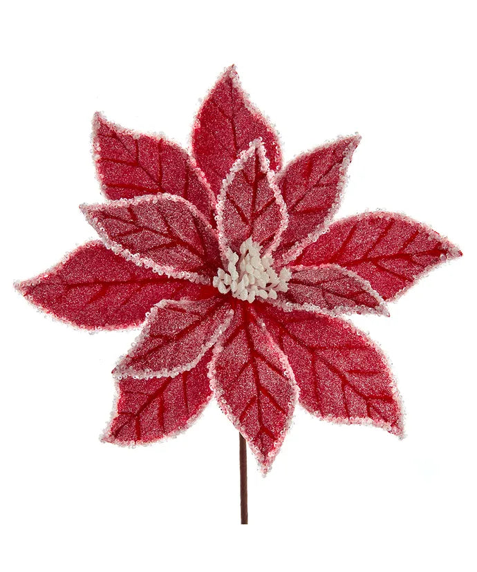 Elevate your seasonal décor with the timeless elegance of the Frosted Velvet Red Poinsettia. Measuring 14", this statement bloom features velvety red petals edged with a frosted, sugar-dusted finish that sparkles in the light. The lush texture and intricate detailing make it the perfect addition to wreaths, garlands, tree décor, or festive floral arrangements.