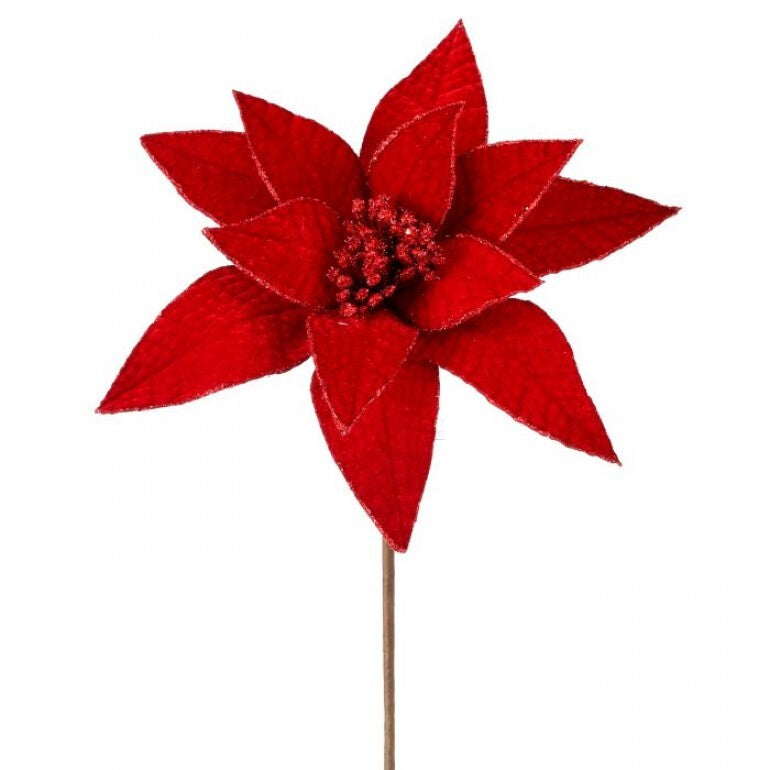 Add a touch of luxury to your holiday decor with our 24" Dark Red Velvet Poinsettia Stem. The rich color and velvet texture evoke elegance, while the glitter edge jewel adds a subtle sparkle. Perfect for adding to your Christmas tree, arrangements, and wreaths, this poinsettia adds a sophisticated touch to any display.