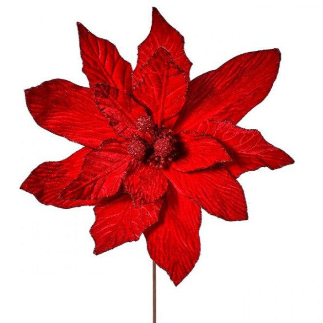 Add a touch of luxury to your holiday decor with our 30" Poinsettia Stem. Choose from burgundy or red to make a statement with this large, 19" diameter flower. Perfect for adorning your Christmas tree or wreath. Elevate your decorations with this elegant and exclusive piece.  Each sold separately.