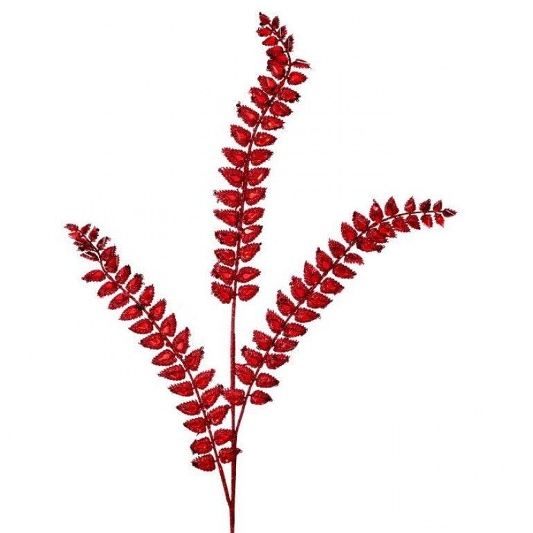 Elevate your decor with the 34.5" Red Jeweled Glitter Fern Spray. Add a touch of luxury and sophistication to any space with this stunning decorative piece. Featuring intricate jeweled detailing and sparkling glitter, this fern spray will add a touch of glamour and elegance to your home.