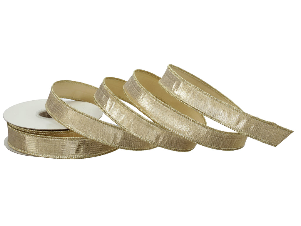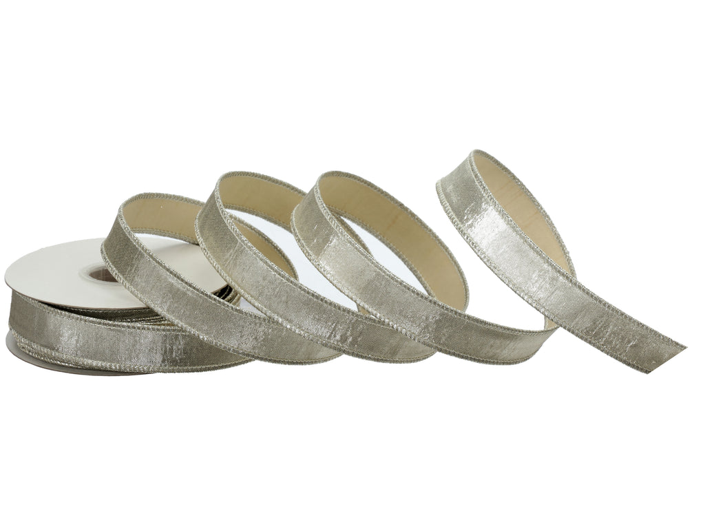 Add a sleek, sophisticated shimmer to your décor with our 1" x 10 Yards Metallic Dupion Ribbon, available in two luminous finishes—Champagne and Platinum. This narrow ribbon features a high-sheen dupioni-style texture that mimics the richness of silk, paired with wired edges for structure and polish. Ideal for detailed accents, layered ribbon work, and luxurious gift wrapping, it offers a refined metallic finish without overpowering your design.