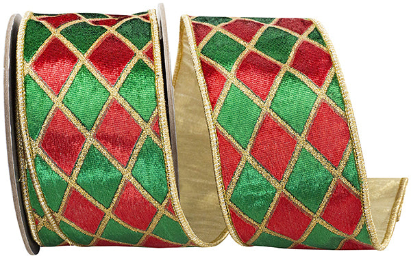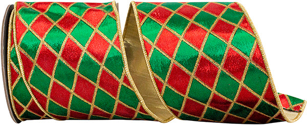 Make a bold, festive statement with our Green & Red Diamond Velvet Metallic Dupioni Back Ribbon available in both 2.5" and 4" on a 5YD roll. This striking ribbon features a vibrant harlequin diamond pattern in classic Christmas green and red, framed with shimmering gold trim for a rich, dimensional finish. The front boasts a velvety texture, while the reverse reveals a metallic Dupioni-inspired backing that adds both structure and sheen.