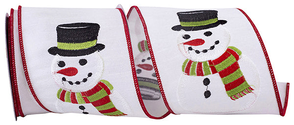 This 4-inch wide, 5-yard long ribbon features an embroidered snowman design that brings festive charm and cheerful detail to your holiday décor. Set against a crisp white background, each snowman is stitched with vibrant red, green, and black thread, complete with a top hat, carrot nose, and striped scarf. The embroidery adds texture and a handcrafted look that stands out in any Christmas-themed arrangement.