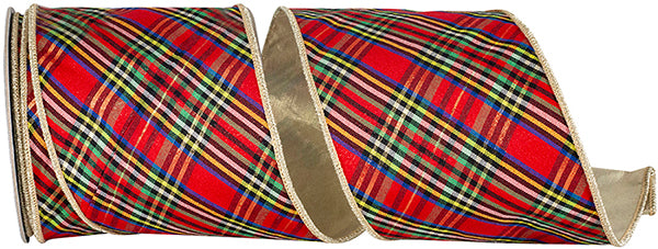 Add timeless charm to your holiday designs with this 7/8" x 10-yard or 4" x 10-yard deluxe diagonal plaid ribbon. Featuring a festive mix of red, green, black, and blue with subtle gold accents, this two-sided ribbon boasts a plaid front and a coordinating gold backing. The wired edge ensures crisp bows and polished finishing touches for wreaths, gifts, and seasonal crafts. Each size sold separately.
