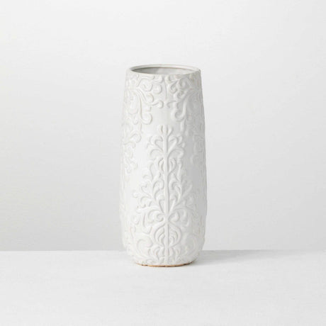 12.5" Cream Ceramic Vase with Tan Floral Pattern