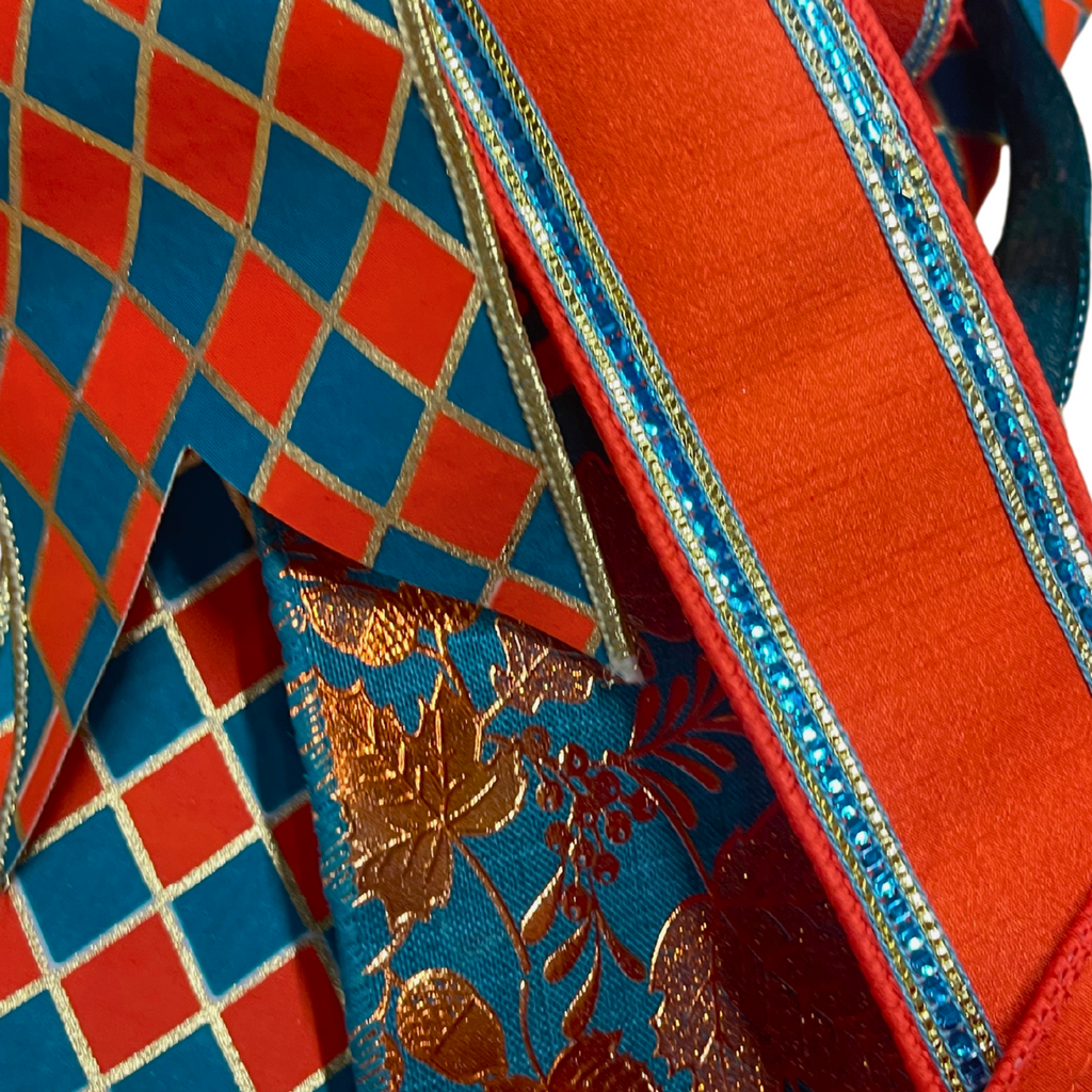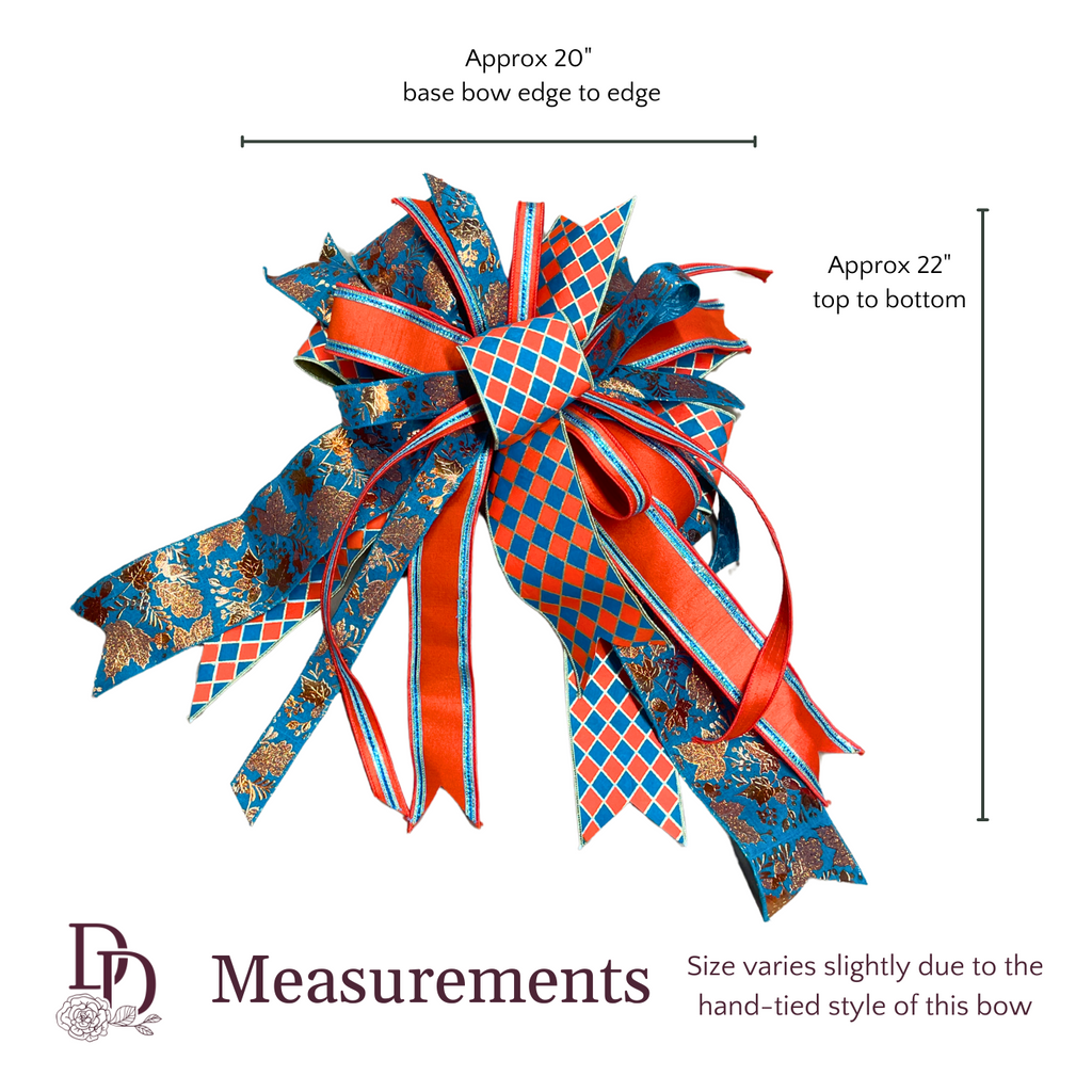 Bring the warmth of autumn into your home with our hand-tied Copper Harvest Fall Bow. Featuring a rich blend of copper, gold, and vibrant orange plaid ribbons accented with shimmering metallic leaves, this designer bow adds elegant texture and color to your fall decor.