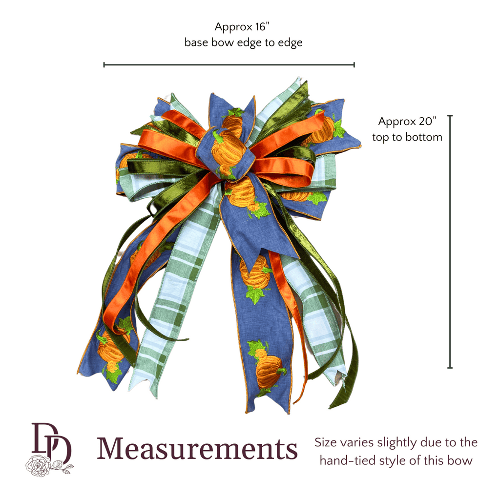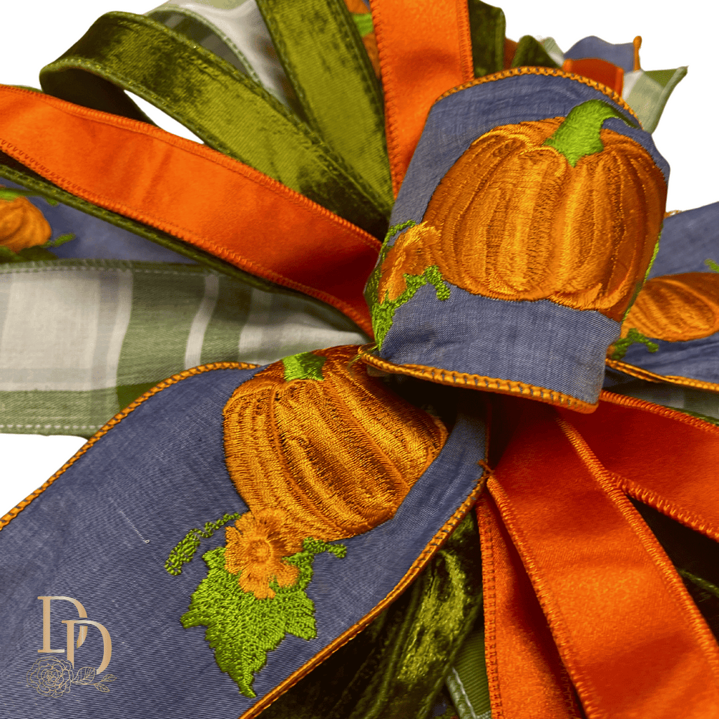 Celebrate the harvest season with the rich colors and textures of our Pumpkin Patch Classic Fall Bow. Featuring embroidered pumpkin ribbons, vibrant satin orange, olive green velvet, and soft plaid accents, this hand-tied designer bow brings sophisticated autumn charm to any display.