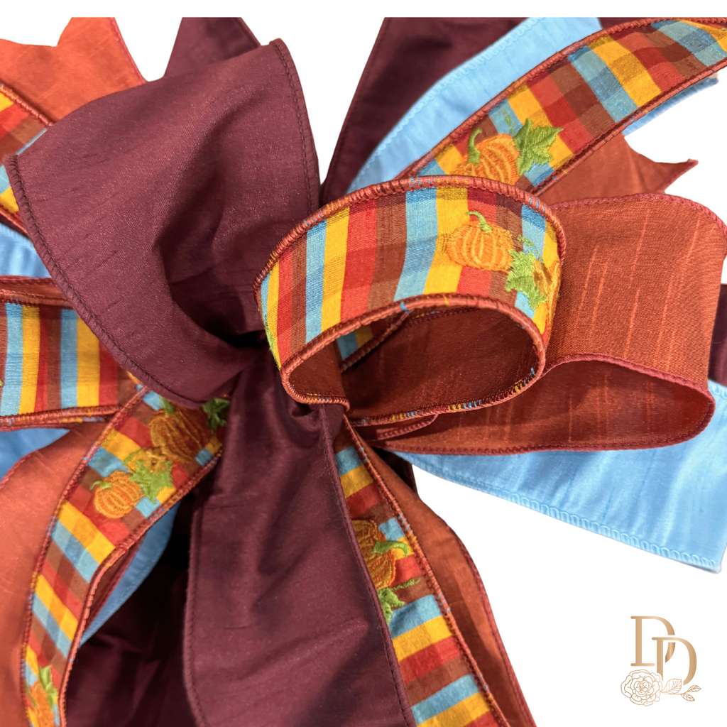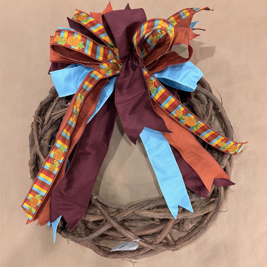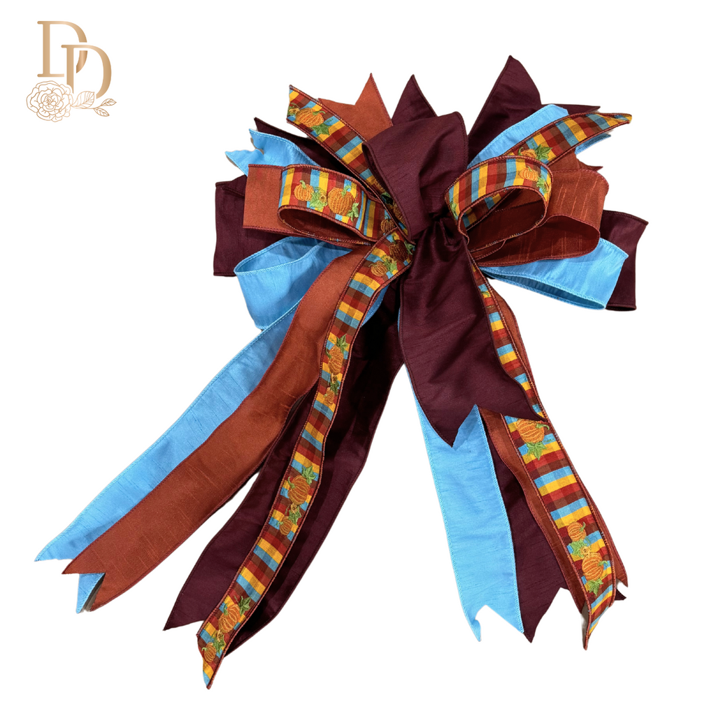 Brighten your fall decor with the bold charm of the Autumn Skies Designer Bow—a joyful mix of rustic harvest tones and clear autumn blue, reminiscent of pumpkin patch strolls under a crisp, cloudless sky.