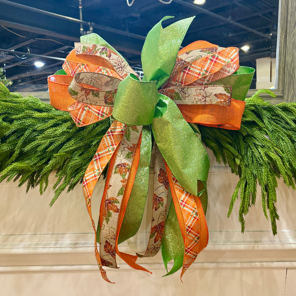 Hand-tied with premium wired ribbons, this lush bow layers soft green sparkle, warm harvest plaid, burnt orange mesh, and glitter-dusted maple leaves in rich amber, gold, and emerald. The result? A textural, dimensional masterpiece that transforms your wreaths, lanterns, and porch decor with instant seasonal splendor.