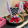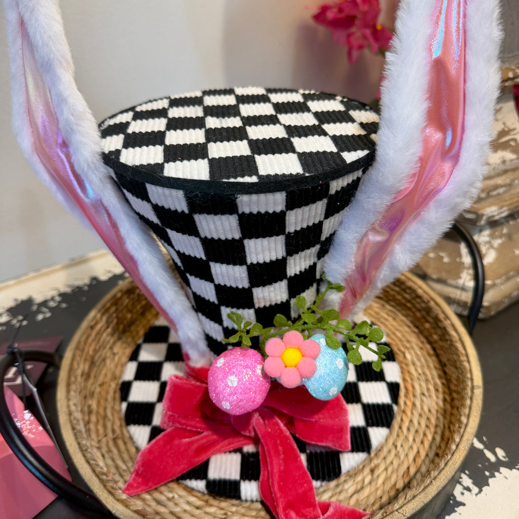 Add a whimsical pop of spring charm to your displays with the Decor Checker Bunny Top Hat, a playful blend of classic pattern and seasonal personality. Standing 12 inches tall with an 8-inch diameter, this decorative piece features a bold black-and-white checker design, soft fabric bunny ears, and subtle textural accents that give it a handcrafted, boutique-style feel.