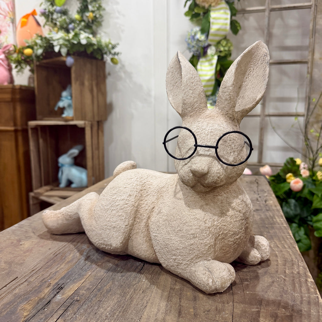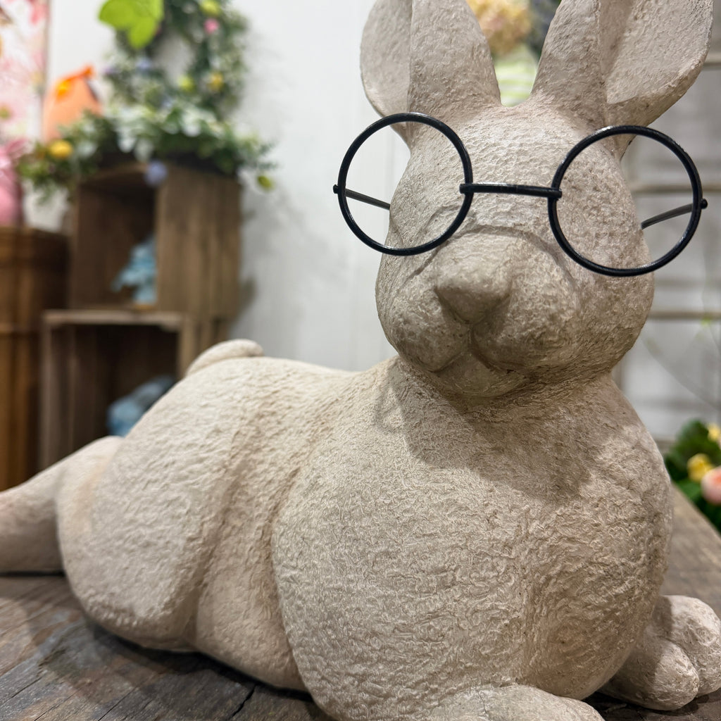Introducing our elegant 15" Resin Resting Bunny, adorned with metal glasses, perfect for your outdoor spring garden. This adorable and exclusive piece adds a touch of sophistication to your Easter decor. Designed for connoisseurs in search of tasteful and fun accents.