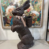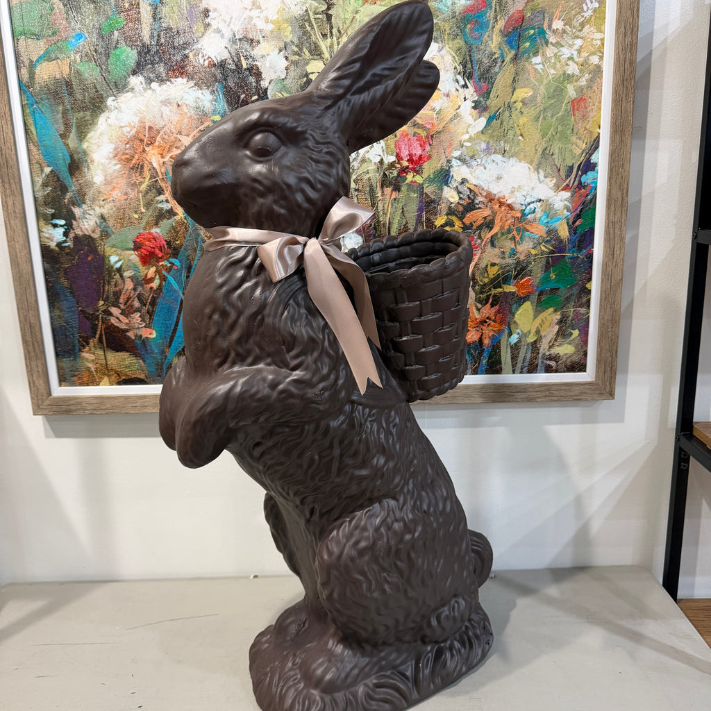 Indulge in the decadent charm of our 35" resin chocolate standing bunny. This Easter decor piece features a deliciously realistic texture, adorned with a basket for goodies and a delicate pink ribbon. Elevate your home with this exclusive and tasteful addition.